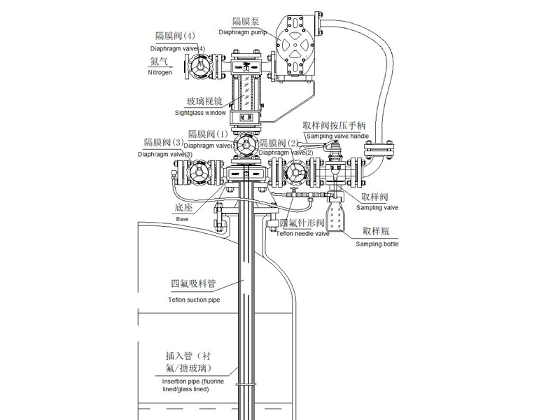 太極反應(yīng)釜在線自動取樣系統(tǒng)(AUTOMATIC SAMPLING SYSTEM)為防腐在線取樣裝置。取樣物料接觸各部件均采用里襯PFA、襯氟材質(zhì),達到防腐目的;四氟吸料管配套插入管(襯氟/搪玻璃材質(zhì))浸于釜內(nèi)料液以下,增加其過程的穩(wěn)定性。隔膜泵以潔凈壓縮空氣為動力,物料在取樣系統(tǒng)中形成閉環(huán)循環(huán)回路,過程快捷、安全、無污染。