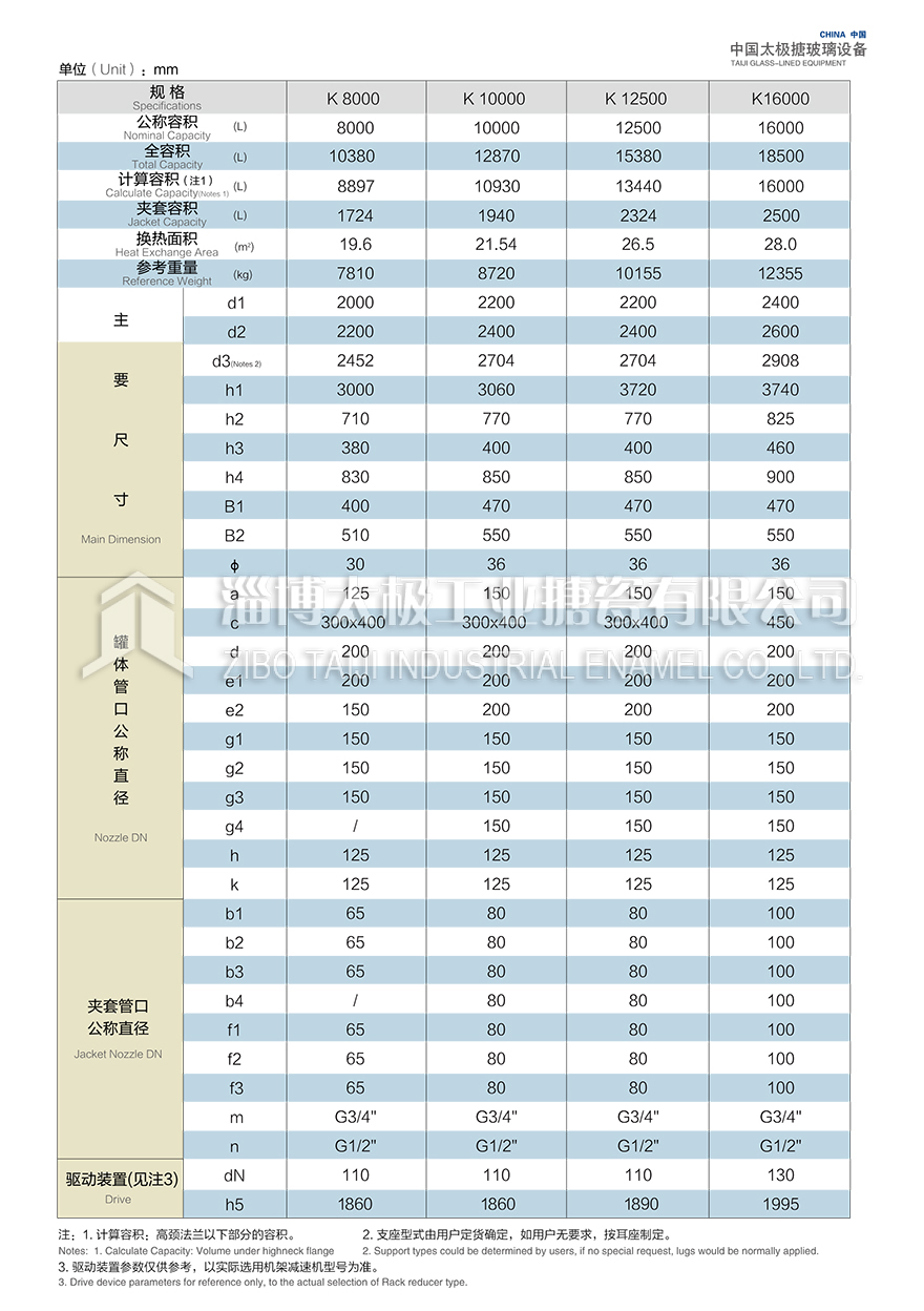 K8000L~K16000L開(kāi)式搪玻璃反應(yīng)釜(搪瓷反應(yīng)釜)設(shè)計(jì)圖紙及相關(guān)參數(shù)如下所示: