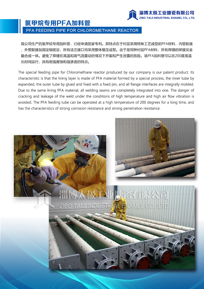 我公司生產(chǎn)的氯甲烷專用加料管,已經(jīng)申請(qǐng)國(guó)家專利。其特點(diǎn)在于襯層采用特殊工藝成型的PFA材料,內(nèi)管脹接,外管膠接加固定銷固定,所有法蘭接口均采用整體模壓成型。由于是同種襯層PFA材料,所有焊縫的焊接完全融合成一體。避免了焊縫在高溫和高氣流震動(dòng)的情況下開裂和產(chǎn)生泄露的危險(xiǎn)。該P(yáng)FA加料管可以在200度高溫長(zhǎng)時(shí)間運(yùn)行,具有耐強(qiáng)腐蝕和強(qiáng)滲透的特點(diǎn)。