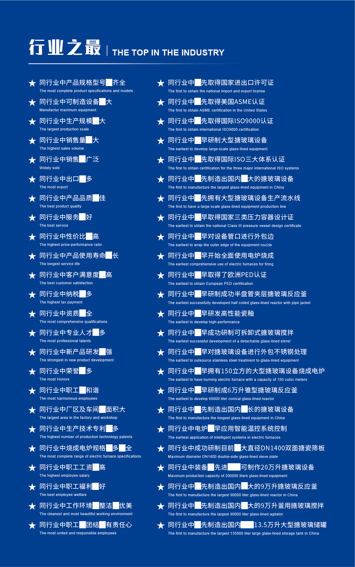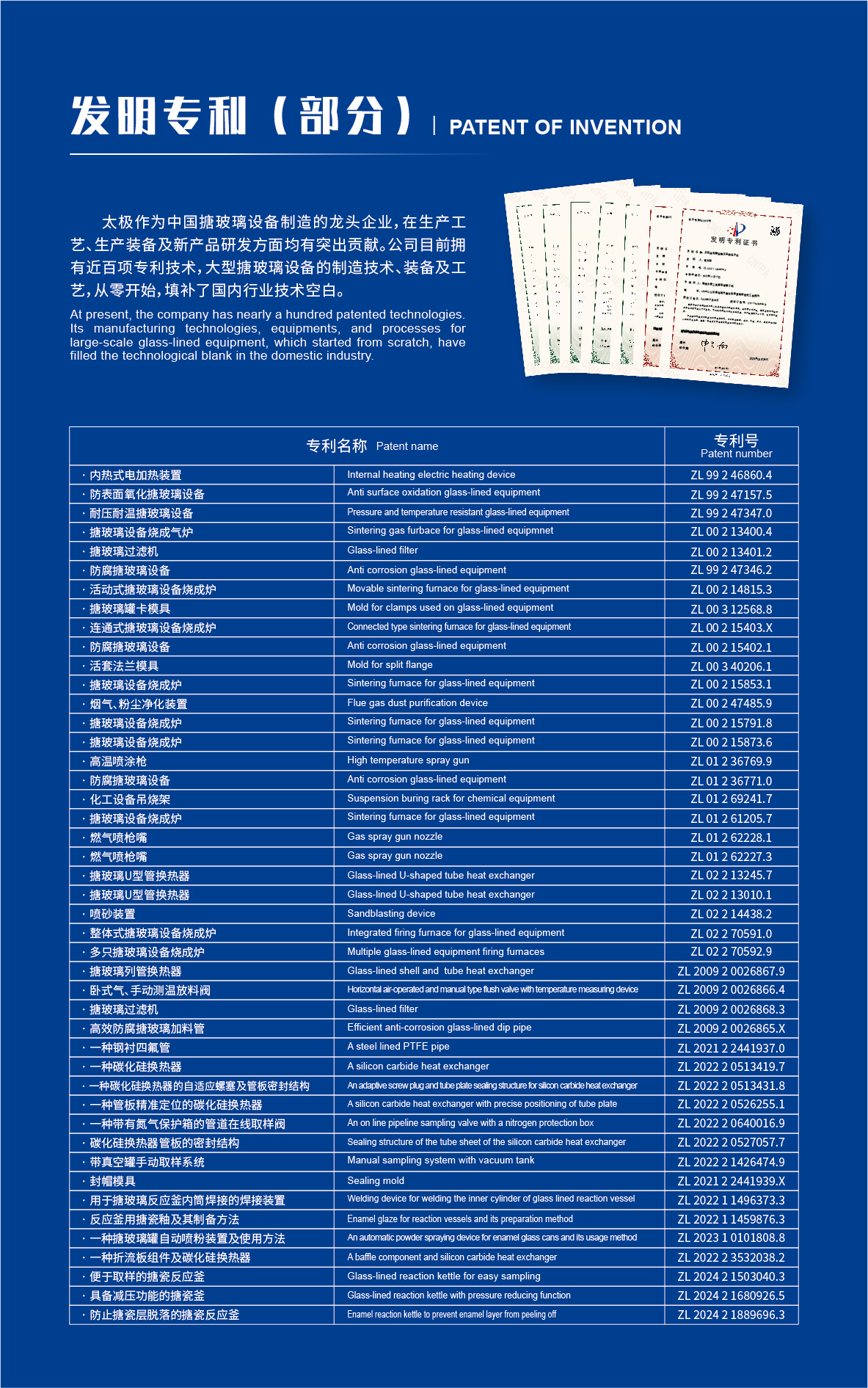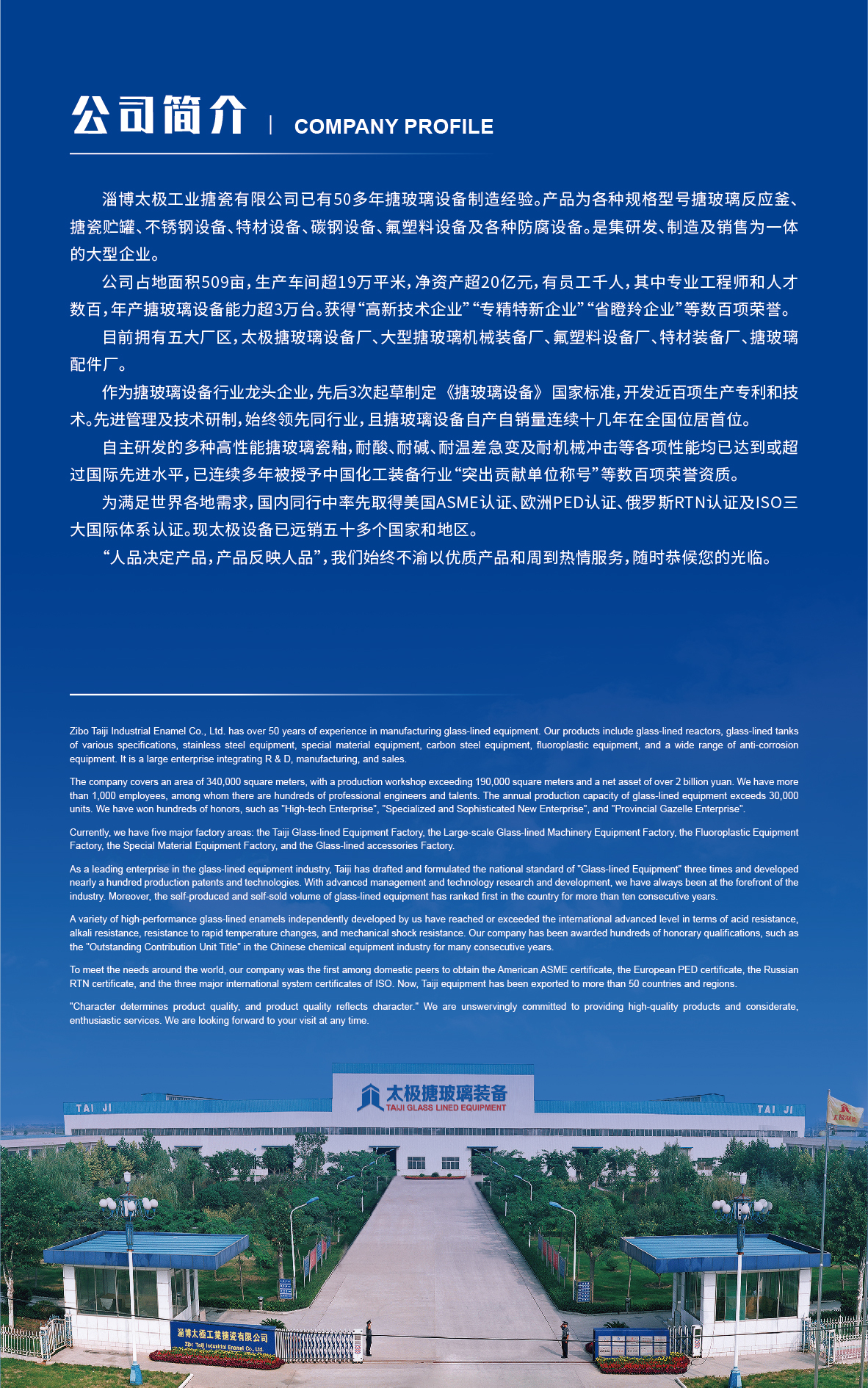 淄博太極在中國(guó)搪玻璃設(shè)備制造行業(yè)中首家通過(guò)ISO90001質(zhì)量體系認(rèn)證,并擁有美國(guó)ASME認(rèn)證、歐洲PED認(rèn)證以及國(guó)家部門頒發(fā)的搪玻璃制造許可證、進(jìn)出口許可證和百余項(xiàng)榮譽(yù)證以及三十六項(xiàng)專利等。